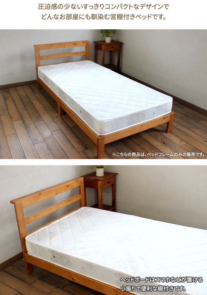 ベッドフレームも床板のすのこも全て天然のパイン材を使用しており、ナチュラルな雰囲気のお部屋にも北欧スタイルのシンプルなインテリアにもマッチします。